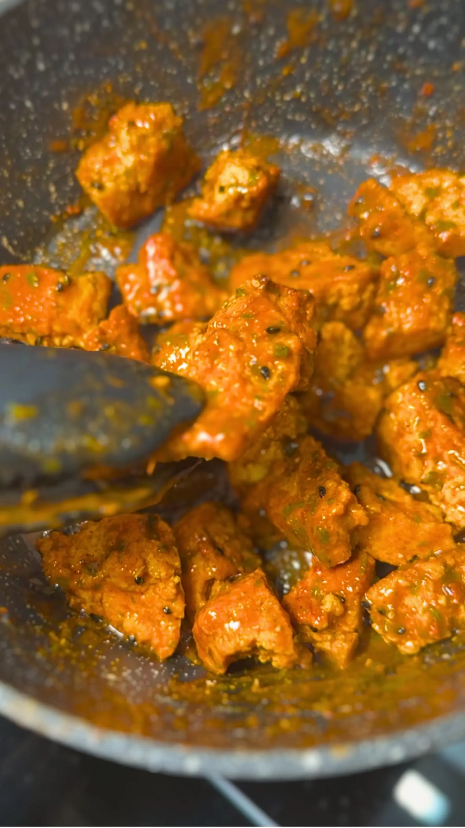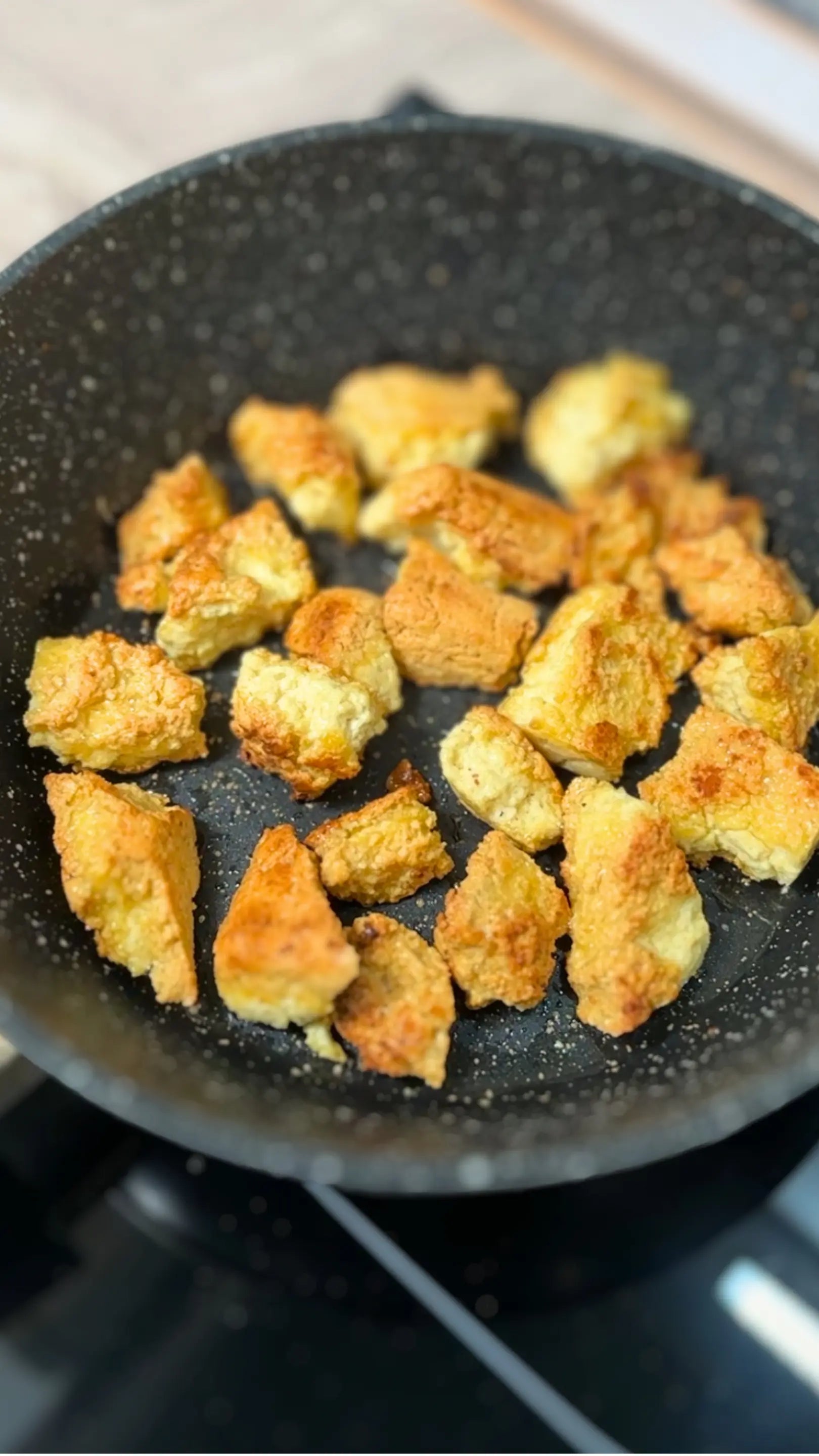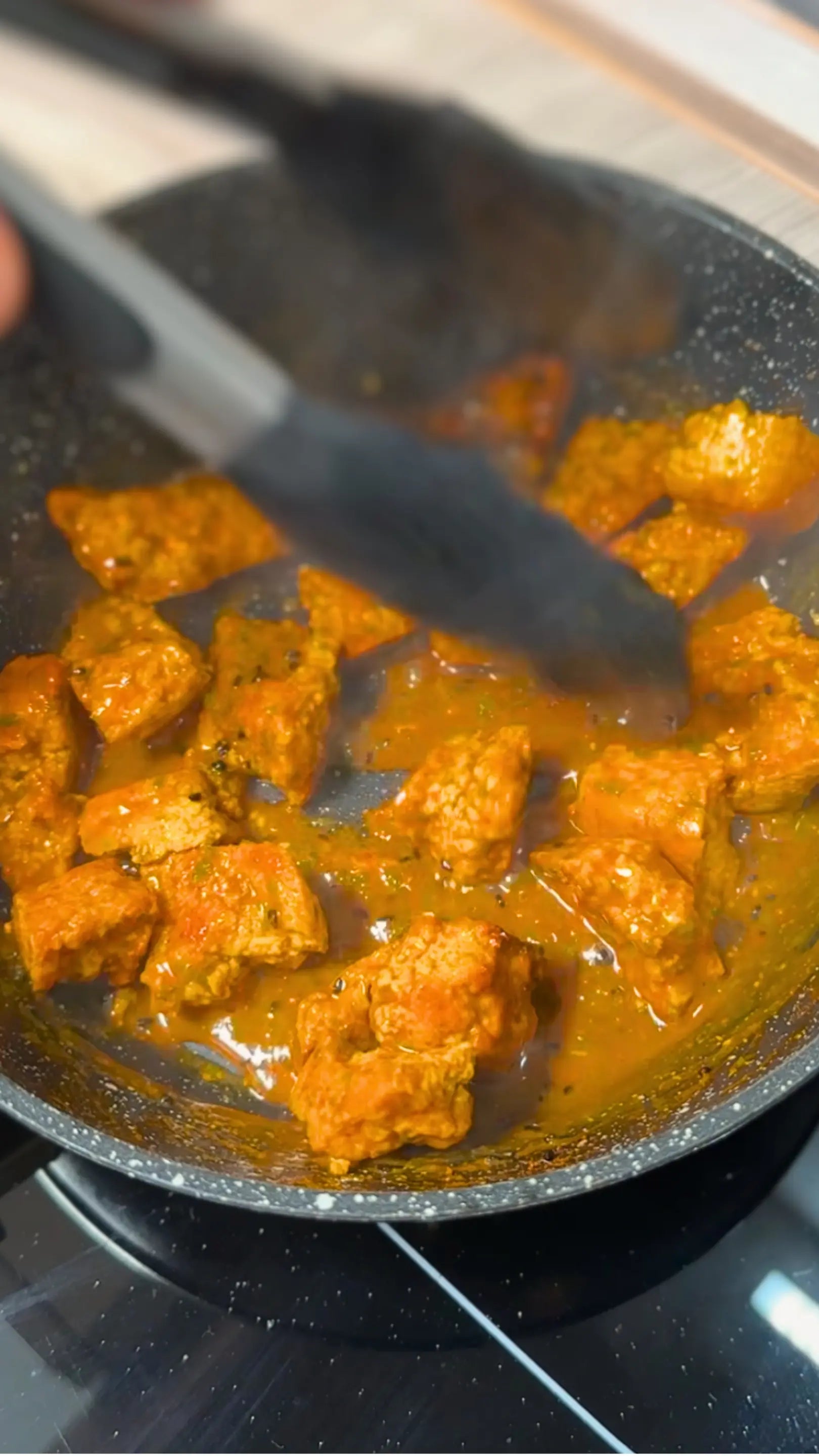- Ganz am Ende in die Pfanne schütten und für eine Minute einkochen lassen. Gründlich mit dem Tofu vermengen.